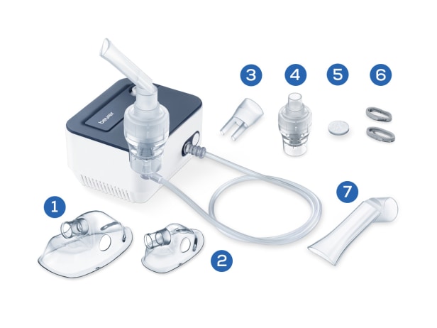 Der Inhalator wird mit einem umfangreichen Zubehör (inkl. Kindermaske) geliefert und eignet sich daher zur Anwendung bei Erwachsenen und Kindern.