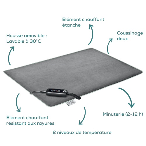 - 2 niveaux de température et 4 réglages de minuterie (2h, 4h, 8h, 12h)