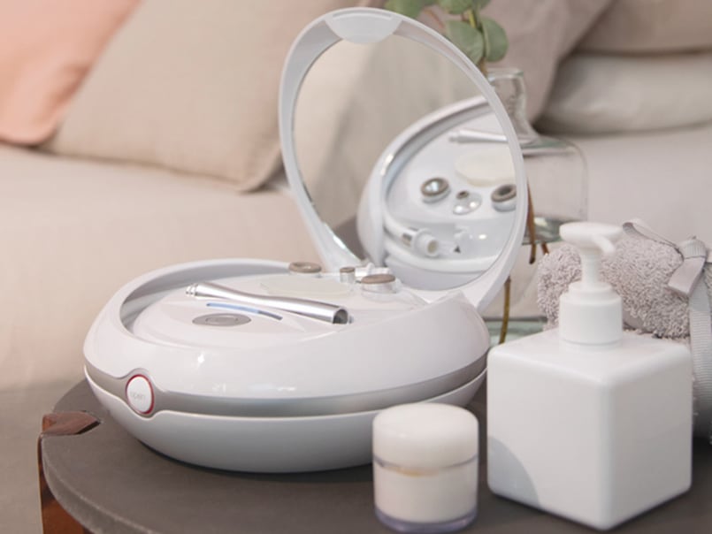 W stacji bazowej znajduje się miejsce na akcesoria do mikrodermabrazji, można ją złożyć i praktycznie przechować. Dzięki wbudowanemu lusterku, które pojawia się po otwarciu stacji bazowej, zabieg można przeprowadzić w dowolnym miejscu (nawet bez dodatkowego lustra).